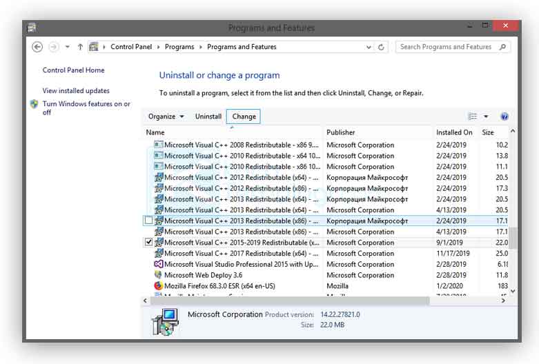 - Cari daftar program Visual yang terpasang pada komputer Anda, kemudian klik change.