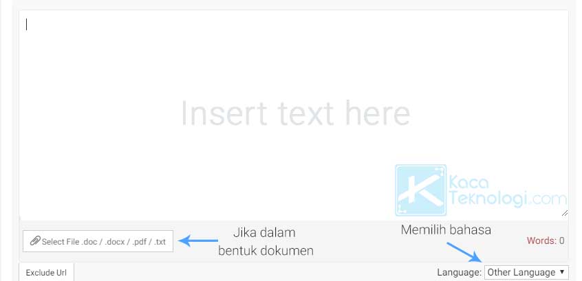 - Silakan buka salah satu situs yang sudah diberikan contohnya di atas. Di sini saya menggunakan Prepostseo. Anda cukup paste teks pada kotak yang tersedia, atau mengunggah dokumen Anda baik itu pdf, txt, docx dll. Jangan lupa untuk memilih bahasa yang digunakan.