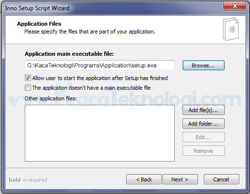 - Keenam, pilih file yang akan dijadikan installer dengan klik browse jika aplikasi anda berformat exe atau centang “The application doesn’t have a main executable file” jika yang akan dijadikan installer adalah sebuah folder atau file yang bukan berformat .exe.