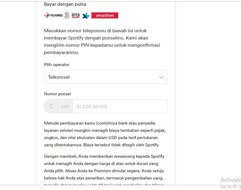 Jika PIN yang dikirim ke nomor yang dituju, maka sampai disini sobat sudah berhasil mengaktifkan fitur Spotify Premium dengan total pembayaran yang sudah dirinci langsung oleh pihak spotify.