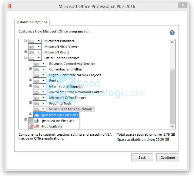 - Selanjutnya, klik tanda + pada bagian Office Shared Features kemudian klik tanda ▾ pada Visual Basic for Applications lalu pilih Run from My Computer.