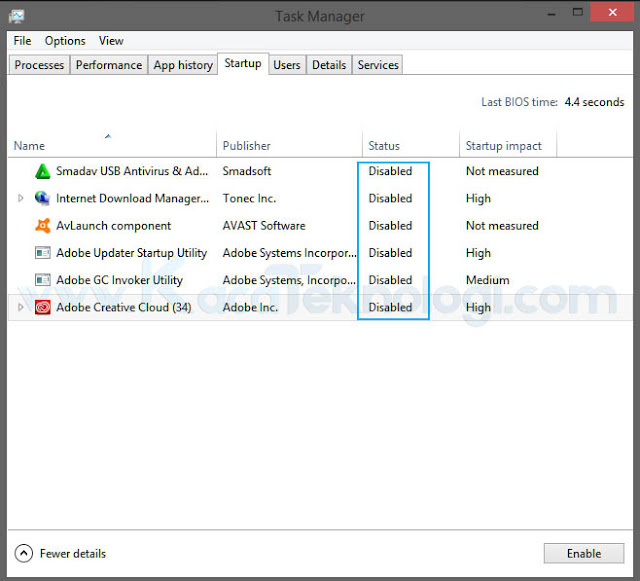 - Dilanjutkan lagi dengan mengklik menu Startup disebelahnya, kemudian klik Open Task Manager → Disable semua layanan yang tersedia → OK.