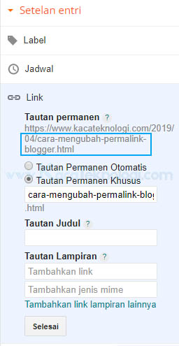 - Anda bisa klik Link → Tautan Permanen Khusus dan anda akan lihat permalink default bawaan blogger sendiri. Lalu anda bisa mengubahnya dengan menghapus atau menambahkan kata pada permalink tersebut.